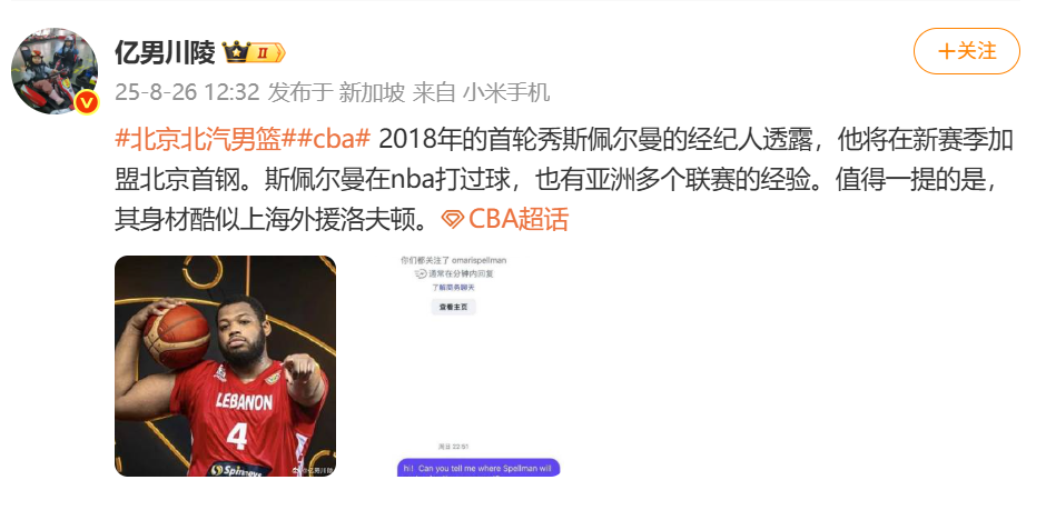此外根据媒体人@亿男川陵报道:2018年的首轮秀斯佩尔曼的经纪人透露,他将在新赛季加盟北京首钢。斯佩尔曼在nba打过球,也有亚洲多个联赛的经验。值得一提的是,其身材酷似上海外援洛夫顿。