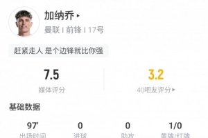 数据方面,加纳乔本场比赛狂射6脚,但无一射正;5次尝试过人,2次成功,18次丢失球权。5次关键传球较为亮眼,但13次对抗4次成功,评分7.5分。
