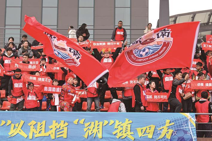 站上看台,每一位球迷都在书写自己和家乡的故事。南湖队的看台上,50多位啦啦队员身着统一服装,手中的横幅随着比赛的节奏挥舞。“南湖加油”的呐喊声此起彼伏,“‘南’以阻挡,‘湖’镇四方”的标语牌格外醒目,整齐划一的应援口号活力四射。