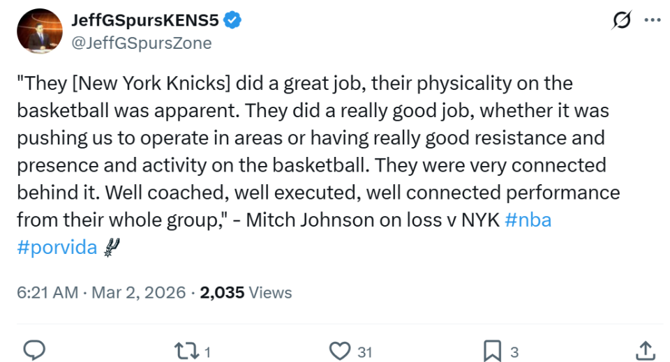 赛后马刺主帅米奇也称赞道:“本场他们表现出色,进攻端身体对抗强度极高,迫使我们不得不改变防守策略,防守端也展现出极强的韧性、存在感与积极性,总而言之,他们攻防做得都非常出色,团队配合默契,这是一场训练有素、执行到位、配合默契的精彩比赛。”