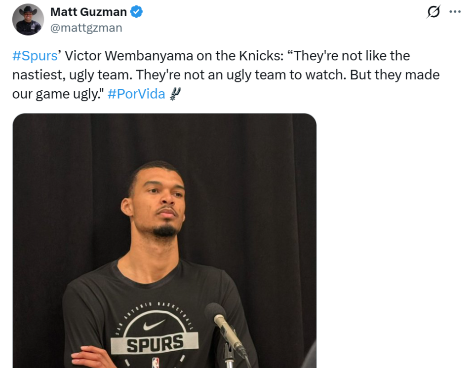 文班同样在赛后对尼克斯大加赞赏:“他们不是那种球风粗野、打得难看的球队,他们的比赛具有观赏性,但他们将我们的比赛节奏搅得支离破碎一团糟。”