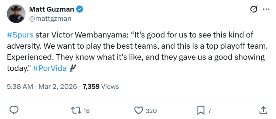 除此之外,马刺队本场三分线外也失准,34次出手仅命中9球,其中文班更是三分7投仅1中。