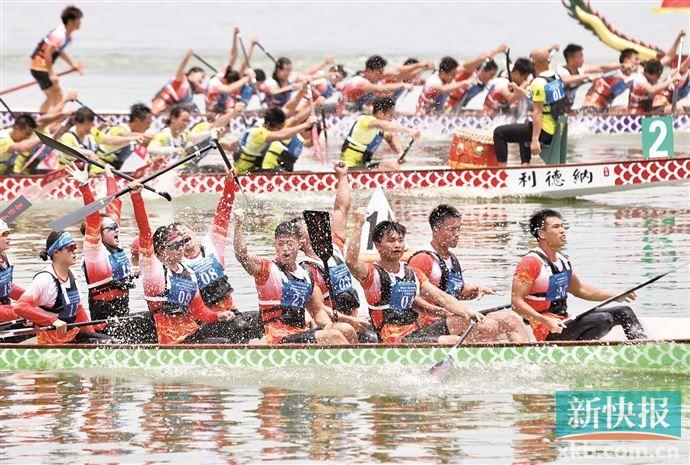 临近中午,现场气温越来越高,运动员们经过一个上午的比拼,体力都有所透支。在压轴进行的混合组(22人龙舟)100米直道赛决赛中,广东队力拔头筹冲过终点,以22秒09的成绩获得该项目的金牌。夺冠一刻,观众席上响起了雷鸣般的掌声。